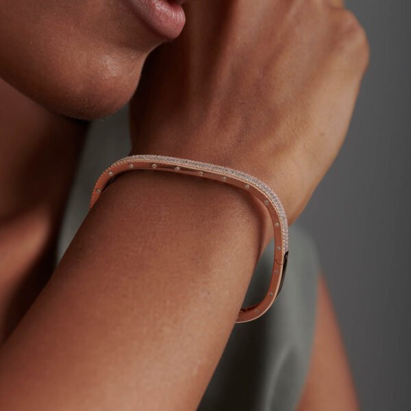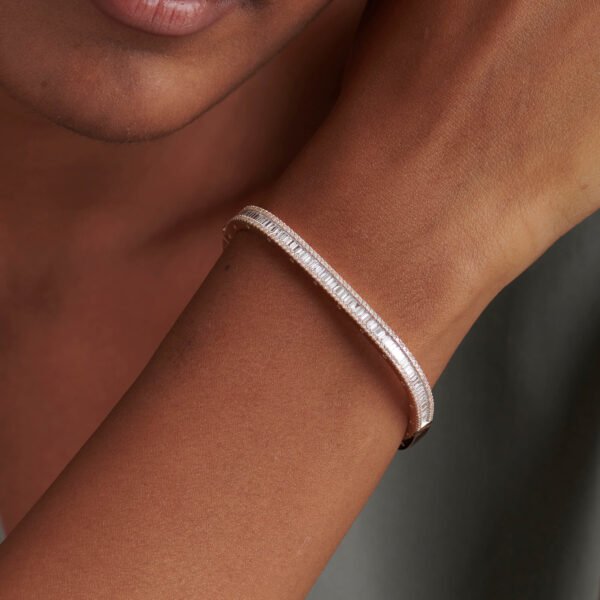 The Baguette & Round Diamond Cushion Bangle is crafted in solid gold with baguette diamonds in channel setting and round diamond in gold pave setting. The shimmering diamond accents along the sides adds an extra touch of glamour and luxury to this already stunning piece. The bangle hinges open and has a box type clasp opening for easier accessibility. This can be one of the favourite pieces to stack with a watch.